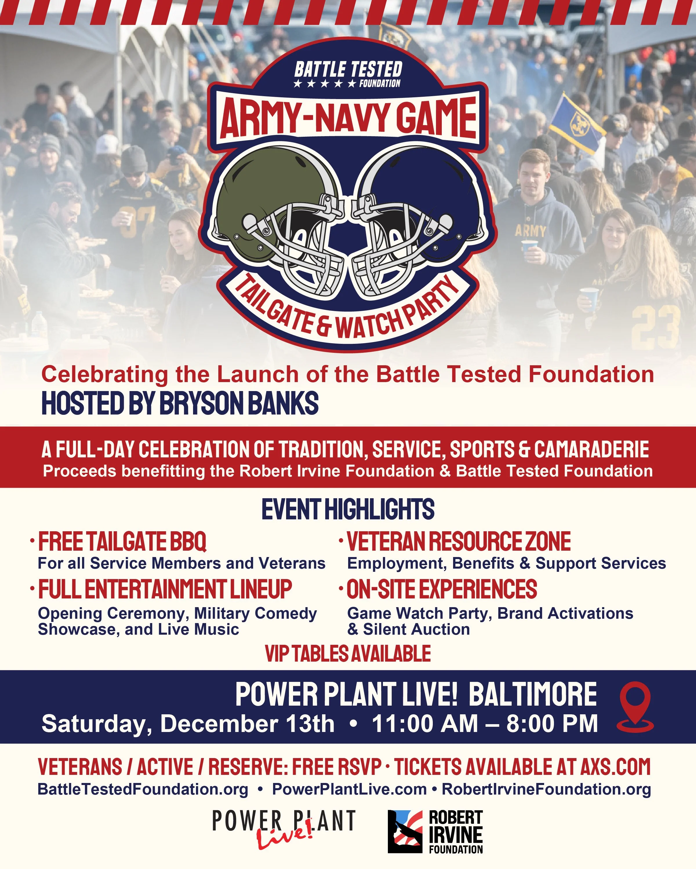 Battle Tested Tailgate & Watch Party – Launch Event Saturday, December 13, 2025 11:00 AM 8:00 PM M&T Bank Stadium 101 Russell Street Baltimore, MD 21230 (map) Google Calendar ICS Join us for the official launch of the Battle Tested Foundation at America’s most storied rivalry — Army vs. Navy. BUY YOUR TICKET AT AXS.COMCan’t make it? Show your support by joining the mission.Donate at GiveButter.com/dYKUo9